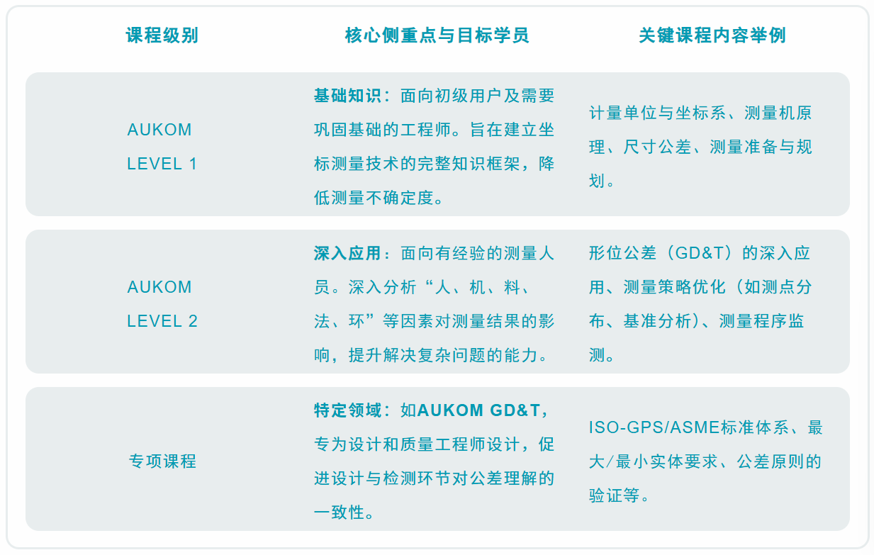 AUKOM认证培训是坐标测量技术领域一套系统性强且受国际认可的专业课程。温泽作为AUKOM授权的培训团队,2025年将为用户开启AUKOM认证培训课程,下表是温泽为用户清晰地梳理了其核心的课程体系:
